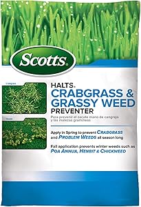 | - Brand: Scotts - Product Dimensions: 15 x 10 x 3 inches - Item Weight: 9.63 pounds - Treats up to 5,000 sq. ft. - One application prevents crabgrass all season long - Apply in spring to prevent crabgrass and problem weeds all season long - Fall application prevents winter weeds, such as poa annua, henbit and chickweed - Apply in fall to prevent moss - Rain, snow or freezing weather after application won't affect product performance | Check Latest Price | |