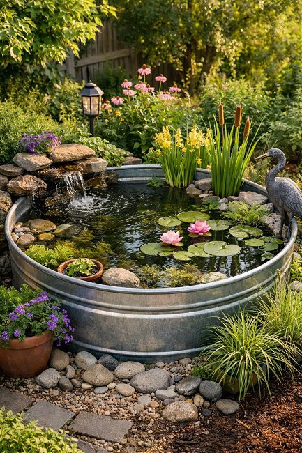 Originally designed for livestock, these galvanized metal tanks are perfect for creating an above-ground pond that adds both beauty and functionality to your outdoor space.